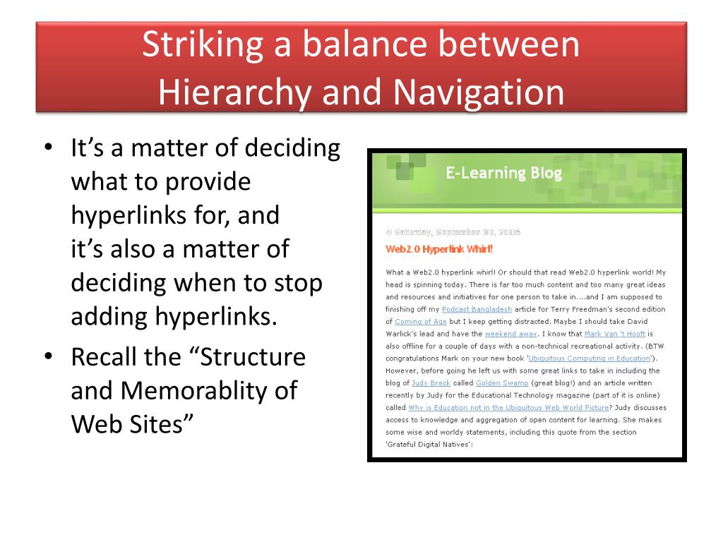 Striking a balance between Hierarchy and Navigation • It’s a matter of deciding what to provide hyperlinks for, and it’s also a matter of deciding when to stop adding hyperlinks. • Recall the “Structure and Memorablity of Web Sites”