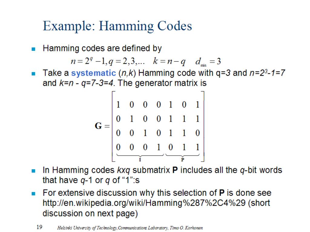 Example: Hamming Codes • Hamming codes are defined by • Take a systematic (n,k) Hamming code with q=3 and n=23-1=7 and k=n - q=7-3=4. The generator matrix is • In Hammingcodes kxq submatrixP includes all the q-bit words that have q-1 or q of “1”:s • For extensive discussion why this selection of P is done see http://en.wikipedia.org/wiki/Hamming%287%2C4%29 (short discussion on next page)