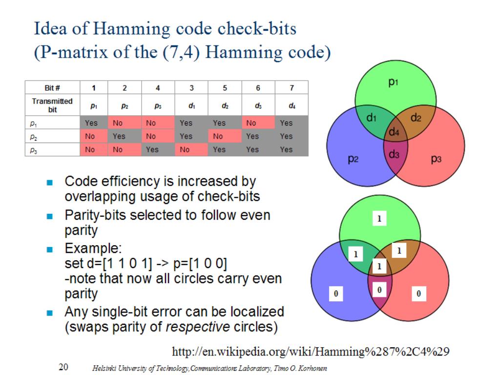 Idea of Hamming code check-bits (P-matrix of the (7,4) Hamming code) • Code efficiency is increased by overlapping usage of check-bits • Parity-bits selected to follow even parity • Example: set d=[1 1 0 1] -> p=[1 0 0]-note that now all circles carry even parity • Any single-bit error can be localized (swaps parity of respective circles) 1 1 1 1 0 0 0 http://en.wikipedia.org/wiki/Hamming%287%2C4%29