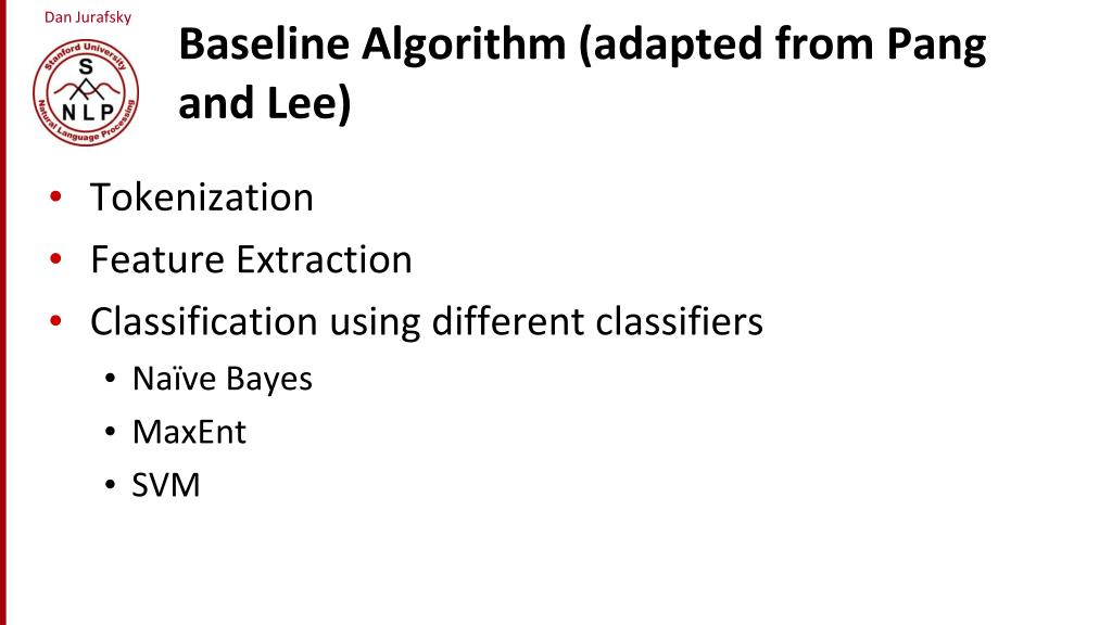 Baseline Algorithm (adapted from Pang and Lee) • Tokenization • Feature Extraction • Classification using different classifiers • Naïve Bayes • MaxEnt • SVM