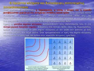 4.2.4) Σχολιασμός • Καμία κατακόρυφη συντεταγμένη δεν είναι ιδανική, αλλά όλες έχουν τα πλεονεκτήματα και τα μειονεκτήματά τους. Για παράδειγμα: • Η χρήση των σίγμα συντεταγμένων, αντί για τις ισοβαρείς ή τις ισοϋψείς, αποτρέπει προβλήματα που δημιουργούνται όταν οι ισοβαρείς ή οι ισοϋψείς τέμνουν το έδαφος, ειδικά σε ορεινές περιοχές. • Σε πολλές περιπτώσεις, η χρήση της συντεταγμένης Eta, αντί για τη σίγμα, βελτιώνει τον υπολογισμό των ανέμων, της κατακόρυφης κίνησης και του υετού σε περιοχές με πολύ απότομη τοπογραφία. • Η χρήση ισεντροπικών συντεταγμένων βελτιώνει τις προγνώσεις των διαδικασιών που χρειάζονται υψηλή ανάλυση σε μέτωπα, αεροχείμαρρους, τροπικούς κυκλώνες αλλά δημιουργεί προβλήματα κοντά στην επιφάνεια της γης. • Για τους παραπάνω λόγους, συχνά στα επιχειρησιακά αριθμητικά μοντέλα πρόγνωσης καιρού χρησιμοποιούνται υβριδικές κατακόρυφες συντεταγμένες που είναι ένας συνδυασμός των παραπάνω συντεταγμένων. Για παράδειγμα: • α) στην τροπόσφαιρα μπορεί να χρησιμοποιηθεί η συντεταγμένη σίγμα ή Eta λόγω του ότι παρουσιάζουν λιγότερα προβλήματα από τις υπόλοιπες, δίνοντας συγχρόνως καλά αποτελέσματα, • β) κοντά στην τροπόπαυση μπορεί να χρησιμοποιηθεί η ισεντροπική συντεταγμένη εξαιτίας της υψηλής ανάλυσης που παρέχει εκεί, και • γ) σε μεγαλύτερα ύψη μπορεί να χρησιμοποιηθεί η ισοβαρική συντεταγμένη καθώς σε αυτά τα ύψη είναι σχεδόν οριζόντια και επίσης δεν υπάρχουν βουνά έτσι ώστε να δημιουργήσει προβλήματα.