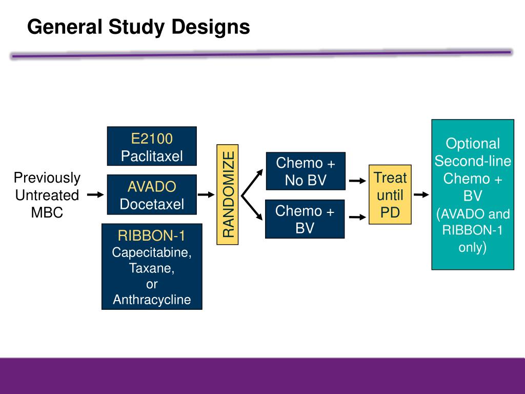General Study Designs OptionalSecond-line Chemo + BV(AVADO and RIBBON-1 only) E2100Paclitaxel Chemo +No BV Treat until PD Previously Untreated MBC AVADO Docetaxel RANDOMIZE Chemo +BV RIBBON-1 Capecitabine, Taxane,orAnthracycline