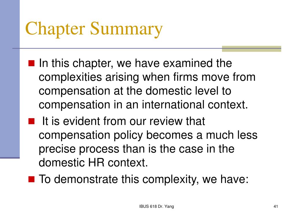Chapter Summary • In this chapter, we have examined the complexities arising when firms move from compensation at the domestic level to compensation in an international context. • It is evident from our review that compensation policy becomes a much less precise process than is the case in the domestic HR context. • To demonstrate this complexity, we have: IBUS 618 Dr. Yang
