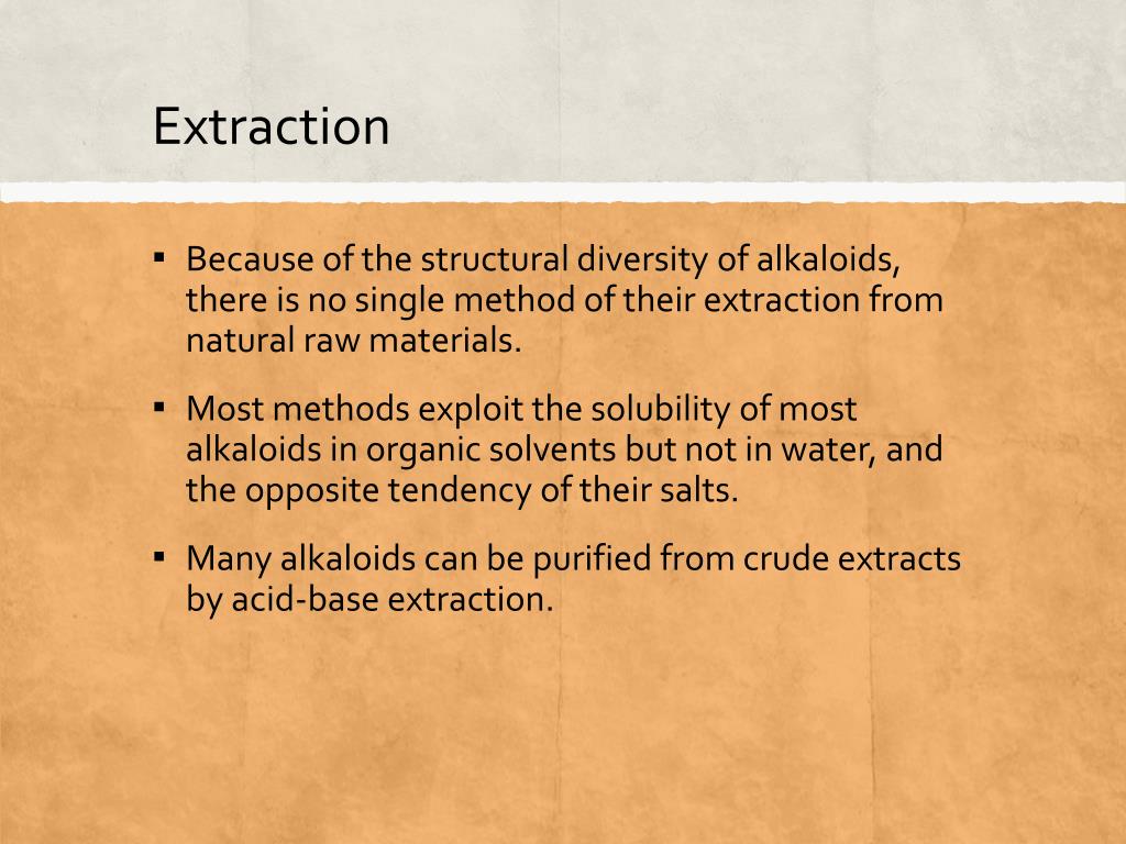 Extraction • Because of the structural diversity of alkaloids, there is no single method of their extraction from natural raw materials. • Most methods exploit the solubility of most alkaloids in organic solvents but not in water, and the opposite tendency of their salts. • Many alkaloids can be purified from crude extracts by acid-base extraction.