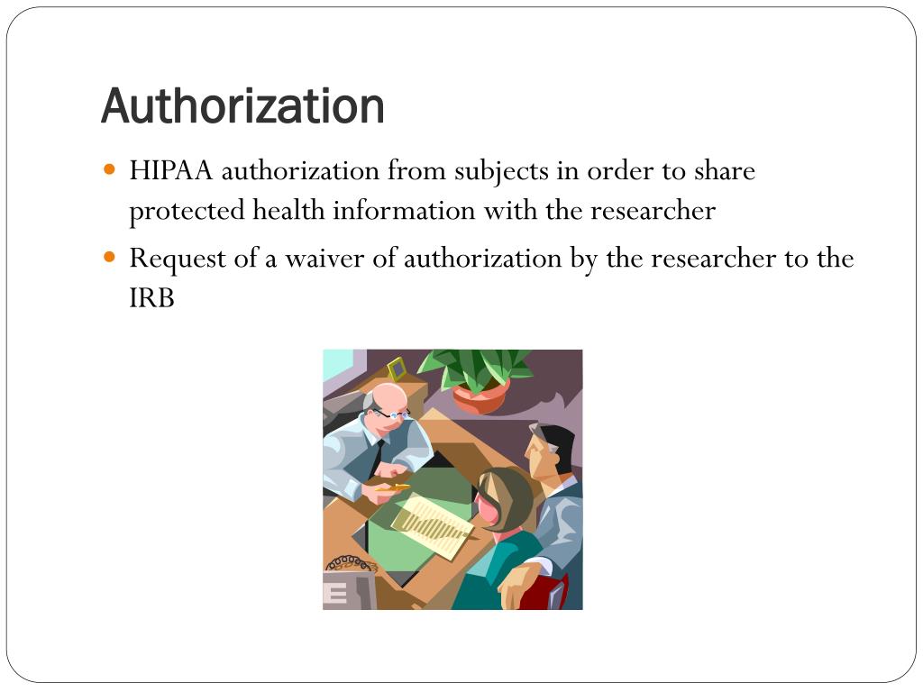 Authorization • HIPAA authorization from subjects in order to share protected health information with the researcher • Request of a waiver of authorization by the researcher to the IRB