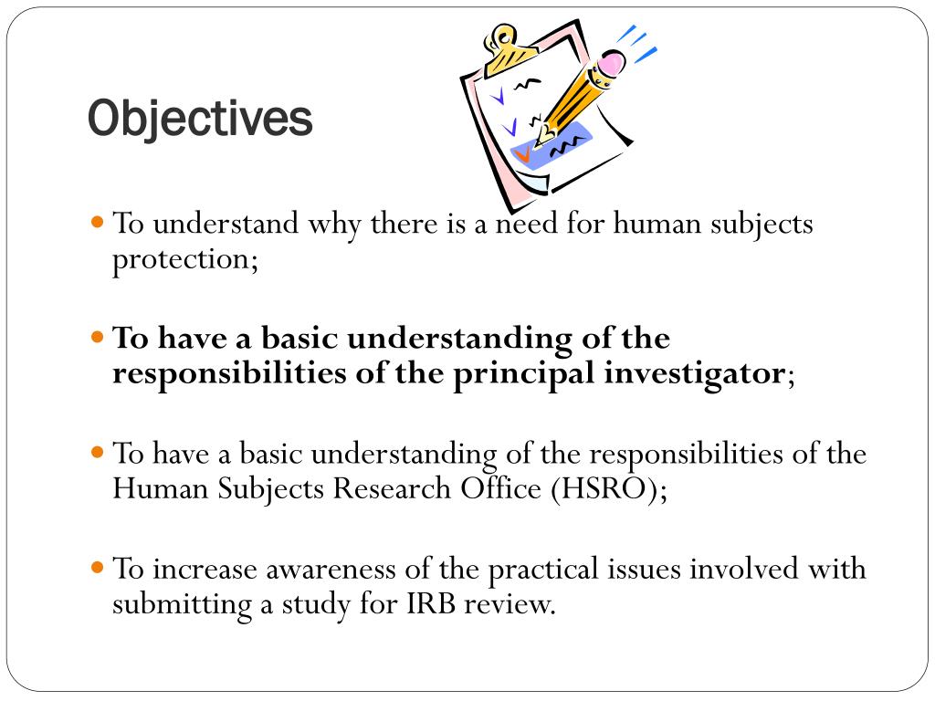 Objectives • To understand why there is a need for human subjects protection; • To have a basic understanding of the responsibilities of the principal investigator; • To have a basic understanding of the responsibilities of the Human Subjects Research Office (HSRO); • To increase awareness of the practical issues involved with submitting a study for IRB review.