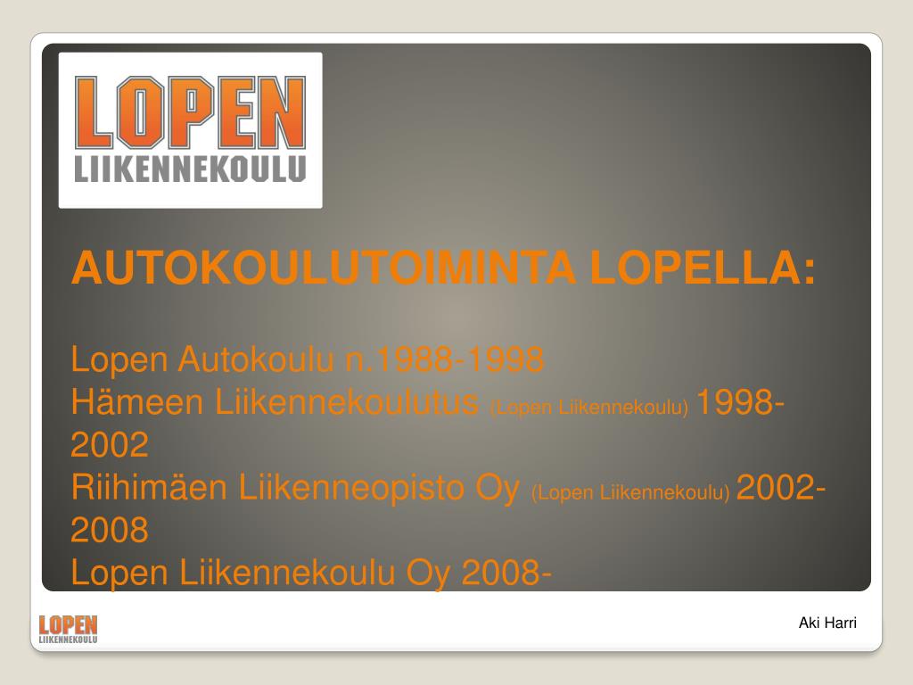 AUTOKOULUTOIMINTA LOPELLA: Lopen Autokoulu n.1988-1998 Hämeen Liikennekoulutus (Lopen Liikennekoulu) 1998-2002 Riihimäen Liikenneopisto Oy (Lopen Liikennekoulu) 2002-2008 Lopen Liikennekoulu Oy 2008- Aki Harri
