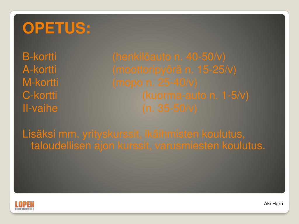 OPETUS: B-kortti (henkilöauto n. 40-50/v) A-kortti (moottoripyörä n. 15-25/v) M-kortti (mopo n. 25-40/v) C-kortti (kuorma-auto n. 1-5/v) II-vaihe (n. 35-50/v) Lisäksi mm. yrityskurssit, ikäihmisten koulutus, taloudellisen ajon kurssit, varusmiesten koulutus. Aki Harri