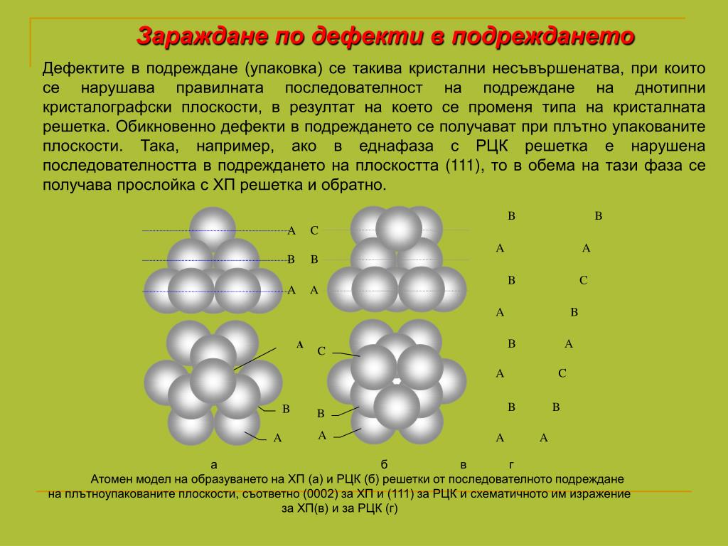 B B A A B C A B B А A C B B A A Зараждане по дефекти в подреждането Дефектите в подреждане (упаковка) се такива кристални несъвършенатва, при които се нарушава правилната последователност на подреждане на днотипни кристалографски плоскости, в резултат на което се променя типа на кристалната решетка. Обикновенно дефекти в подреждането се получават при плътно упакованите плоскости. Така, например, ако в еднафаза с РЦК решетка е нарушена последователността в подреждането на плоскостта (111), то в обема на тази фаза се получава прослойка с ХП решетка и обратно. A C B B A A A C B B A A а б в г Атомен модел на образуването на ХП (а) и РЦК (б) решетки от последователното подреждане на плътноупакованите плоскости, съответно (0002) за ХП и (111) за РЦК и схематичното им изражение за ХП(в) и за РЦК (г)