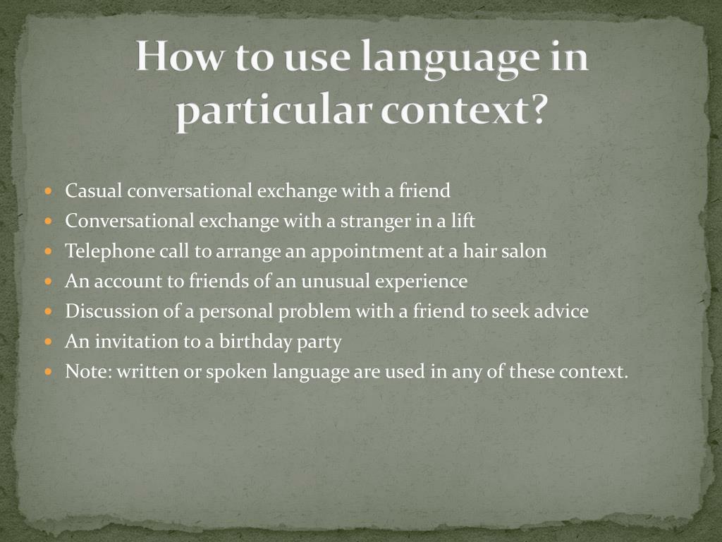How to use language in particular context? • Casual conversational exchange with a friend • Conversational exchange with a stranger in a lift • Telephone call to arrange an appointment at a hair salon • An account to friends of an unusual experience • Discussion of a personal problem with a friend to seek advice • An invitation to a birthday party • Note: written or spoken language are used in any of these context.