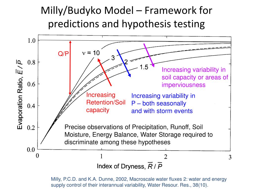 Milly/Budyko Model – Framework for predictions and hypothesis testing Q/P Increasing variability in soil capacity or areas of imperviousness Increasing Retention/Soil capacity Increasing variability in P – both seasonally and with storm events Precise observations of Precipitation, Runoff, Soil Moisture, Energy Balance, Water Storage required to discriminate among these hypotheses Milly, P.C.D. and K.A. Dunne, 2002, Macroscale water fluxes 2: water and energy supply control of their interannual variability, Water Resour. Res., 38(10).