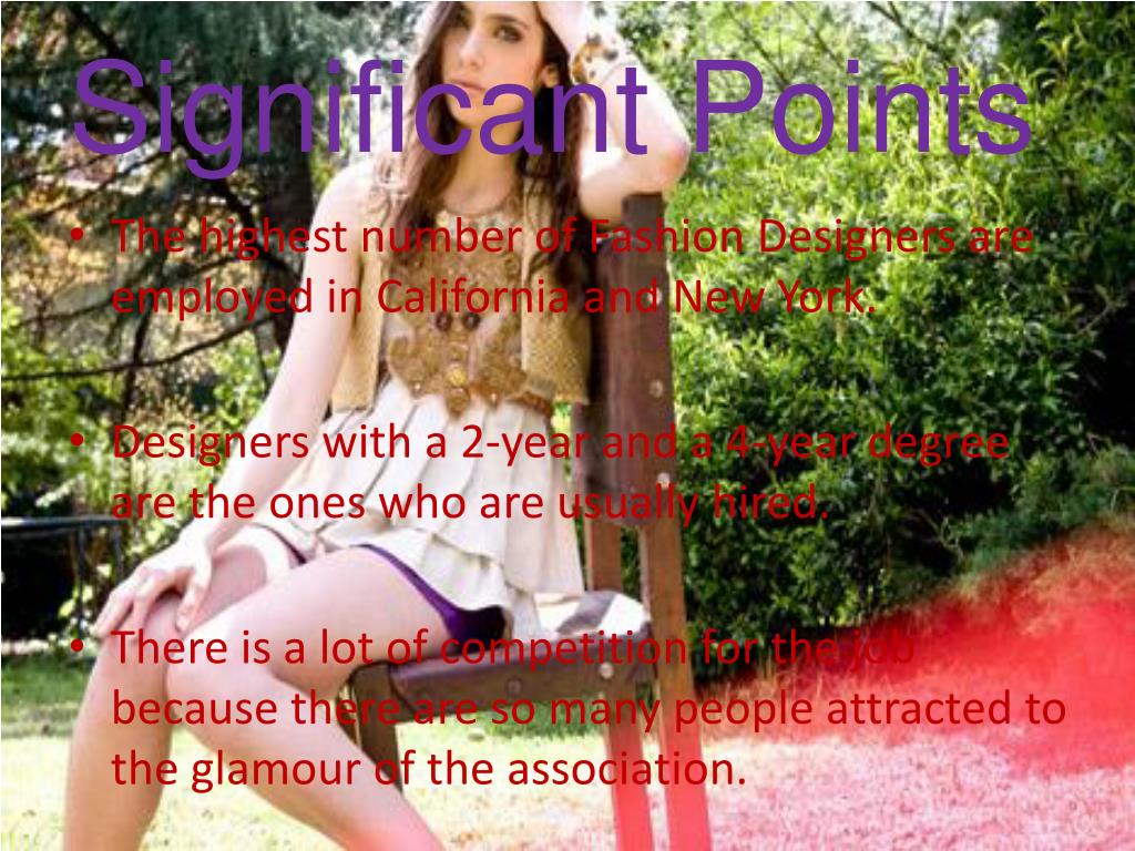 Significant Points • The highest number of Fashion Designers are employed in California and New York. • Designers with a 2-year and a 4-year degree are the ones who are usually hired. • There is a lot of competition for the job because there are so many people attracted to the glamour of the association.