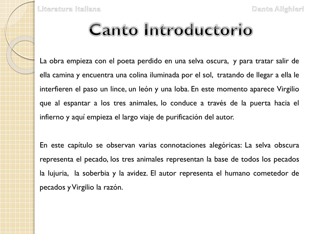 LiteraturaItaliana Dante Alighieri Canto Introductorio La obra empieza con el poeta perdido en una selva oscura, y para tratar salir de ella camina y encuentra una colina iluminada por el sol, tratando de llegar a ella le interfieren el paso un lince, un león y una loba. En este momento aparece Virgilio que al espantar a los tres animales, lo conduce a través de la puerta hacia el infierno y aquí empieza el largo viaje de purificación del autor. En este capítulo se observan varias connotaciones alegóricas: La selva obscura representa el pecado, los tres animales representan la base de todos los pecados la lujuria, la soberbia y la avidez. El autor representa el humano cometedor de pecados y Virgilio la razón.