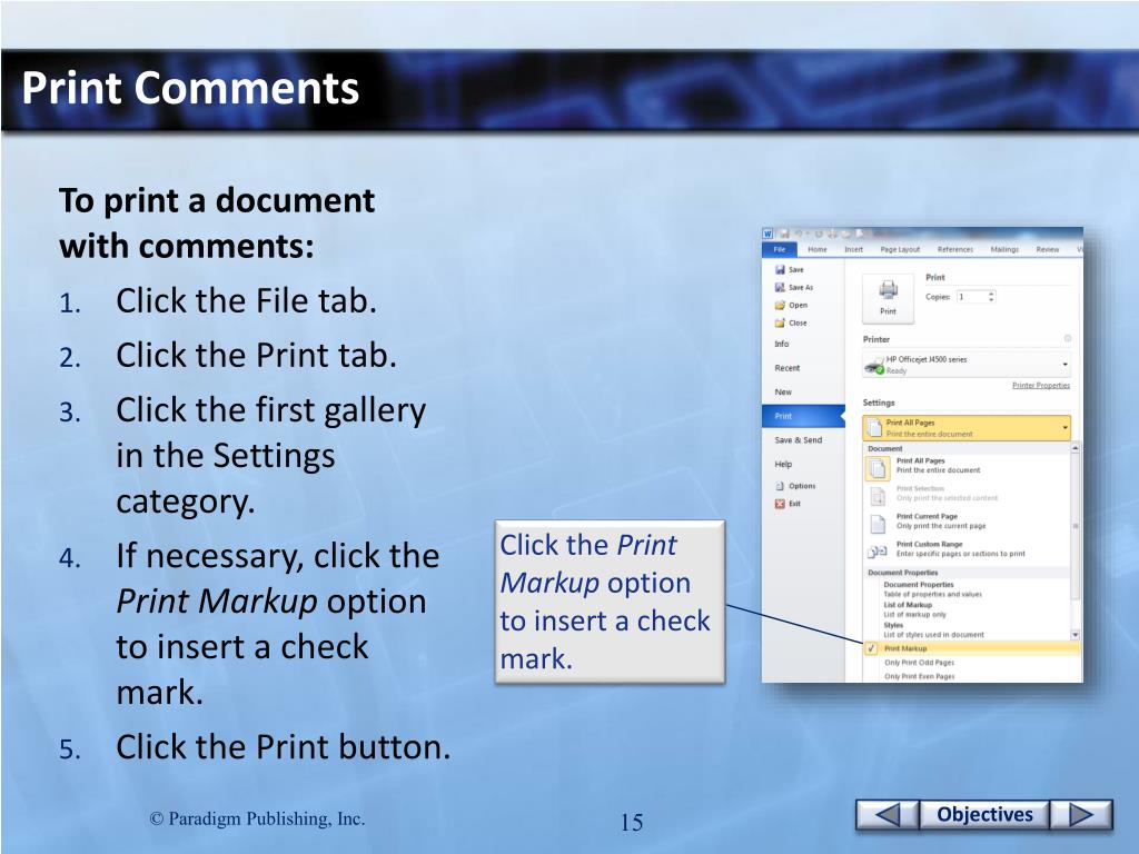 Print Comments To print a document with comments: • Click the File tab. • Click the Print tab. • Click the first gallery in the Settings category. • If necessary, click the Print Markup option to insert a check mark. • Click the Print button. Click the Print Markup option to insert a check mark.