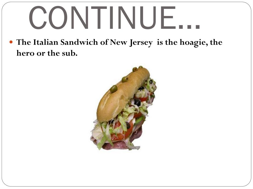 CONTINUE… • The Italian Sandwich of New Jersey is the hoagie, the hero or the sub.