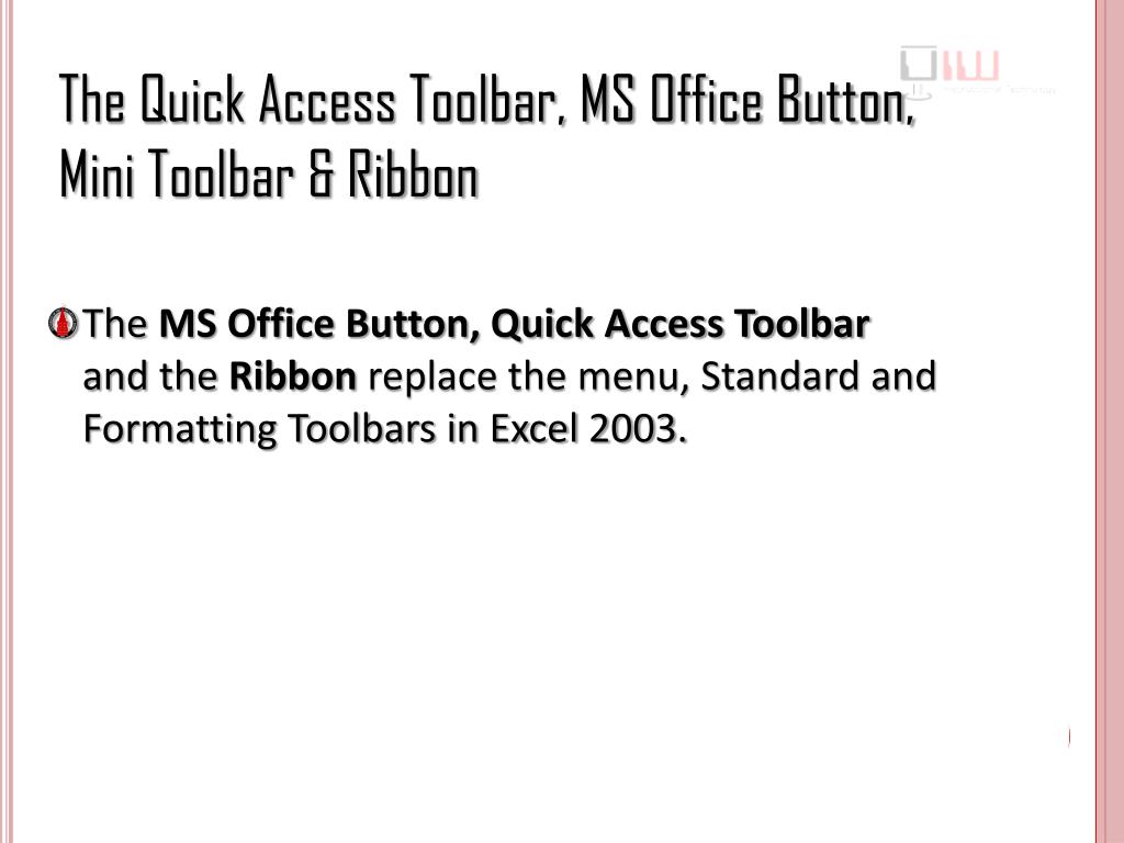 The Quick Access Toolbar, MS Office Button, Mini Toolbar & Ribbon • The MS Office Button, Quick Access Toolbar and the Ribbon replace the menu, Standard and Formatting Toolbars in Excel 2003.