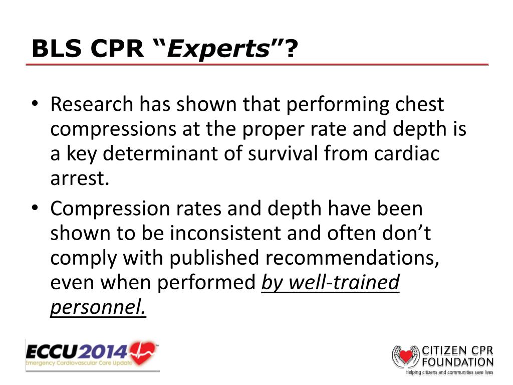 BLS CPR “Experts”? • Research has shown that performing chest compressions at the proper rate and depth is a key determinant of survival from cardiac arrest. • Compression rates and depth have been shown to be inconsistent and often don’t comply with published recommendations, even when performed by well-trained personnel.