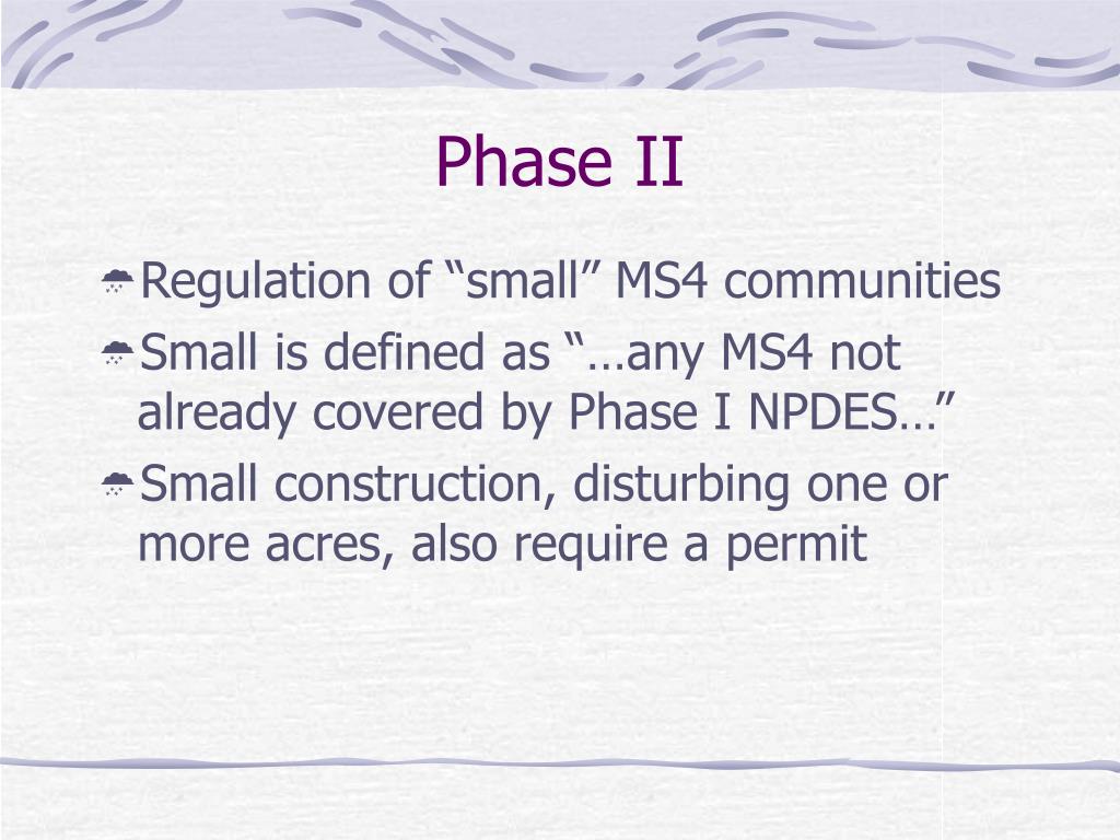 Phase II • Regulation of “small” MS4 communities • Small is defined as “…any MS4 not already covered by Phase I NPDES…” • Small construction, disturbing one or more acres, also require a permit