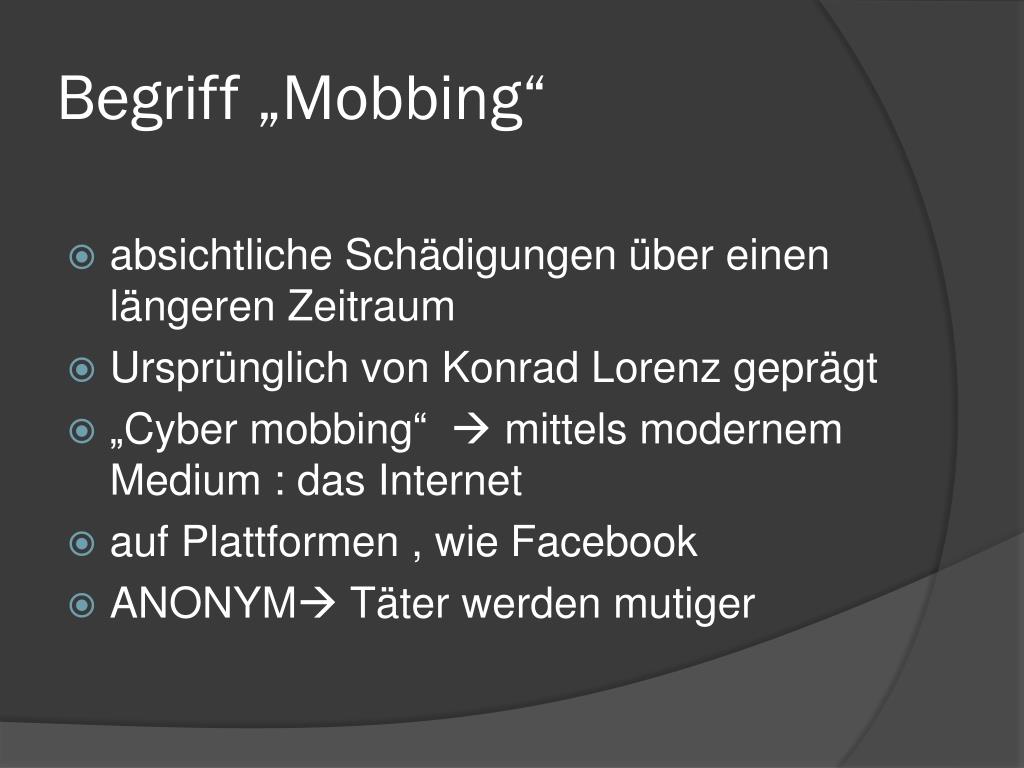 Begriff „Mobbing“ • absichtliche Schädigungen über einen längeren Zeitraum • Ursprünglich von Konrad Lorenz geprägt • „Cybermobbing“ mittels modernem Medium : das Internet • auf Plattformen , wie Facebook • ANONYM Täter werden mutiger