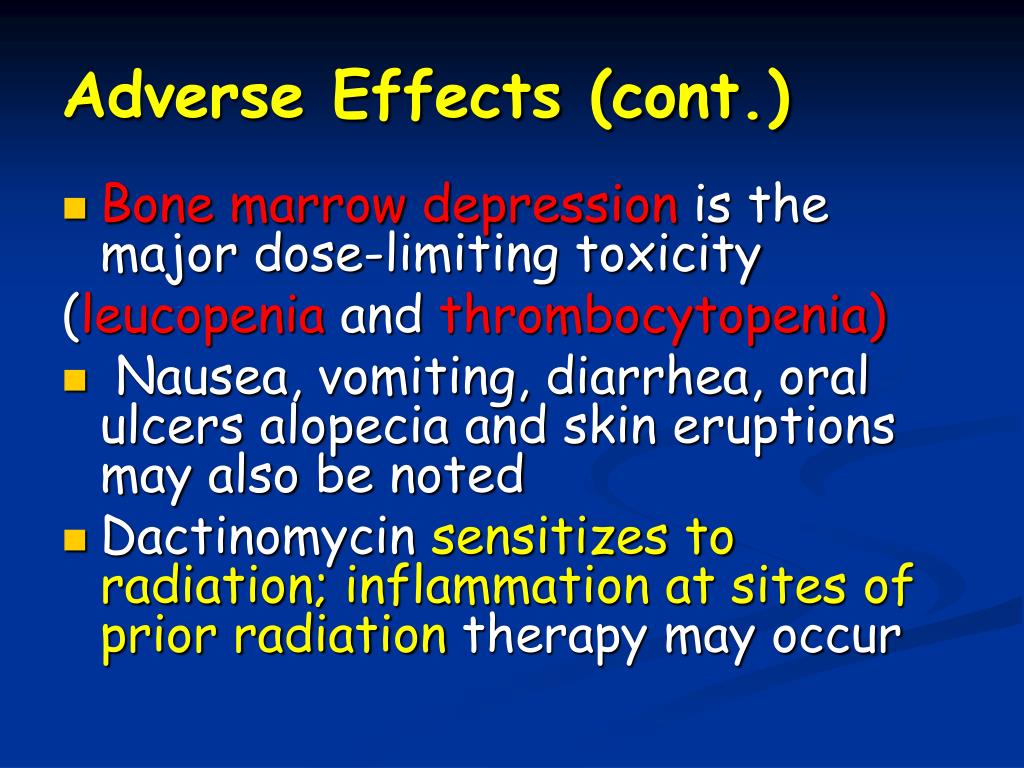 Adverse Effects (cont.) • Bone marrow depression is the major dose-limiting toxicity (leucopenia and thrombocytopenia) • Nausea, vomiting, diarrhea, oral ulcers alopecia and skin eruptions may also be noted • Dactinomycinsensitizes to radiation; inflammation at sites of prior radiation therapy may occur