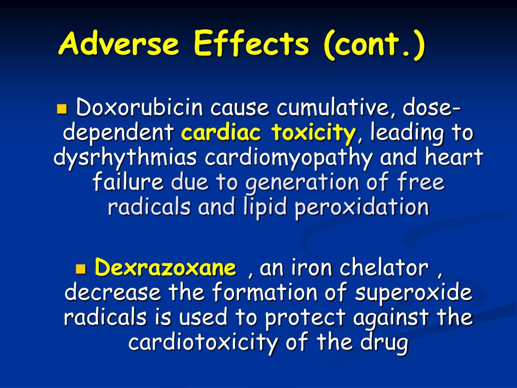 Adverse Effects(cont.) • Doxorubicin cause cumulative, dose- dependent cardiac toxicity, leading to dysrhythmias cardiomyopathy and heart failuredue to generation of free radicals and lipid peroxidation • Dexrazoxane, an iron chelator, decrease the formation of superoxide radicals is used to protect against the cardiotoxicity of the drug