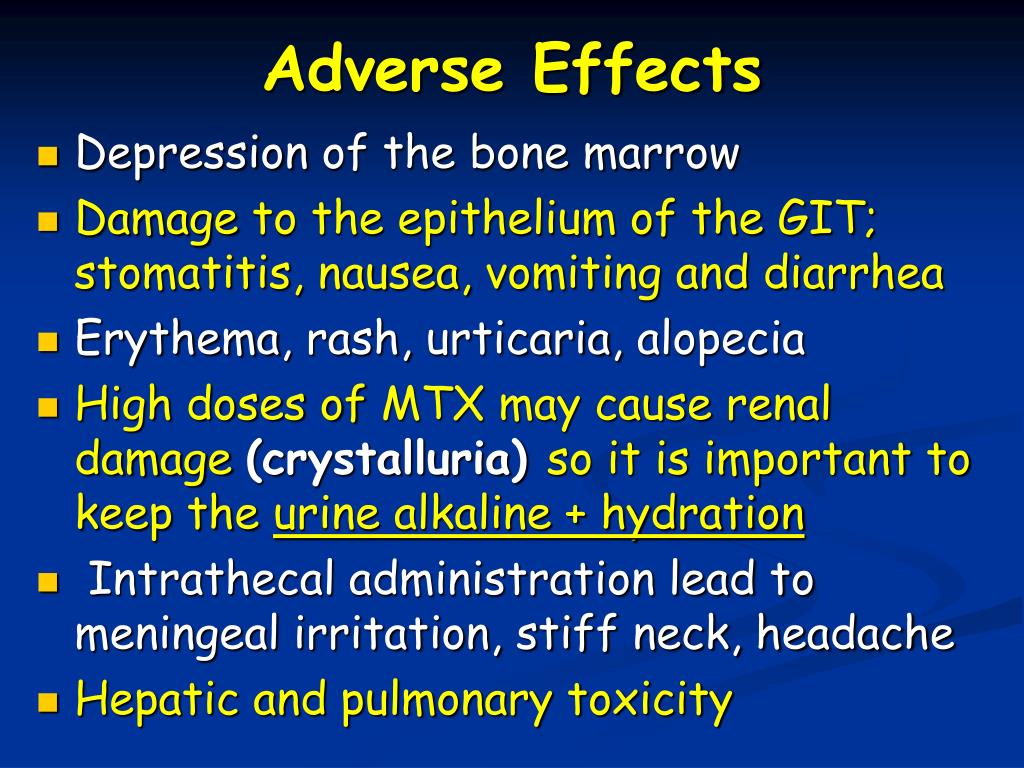 Toxic Effects: • It may lead to nausea, vomiting, anorexia, diarrhea and alopecia • Severe ulceration of the oral and gastrointestinal mucosa • Bone marrow depression