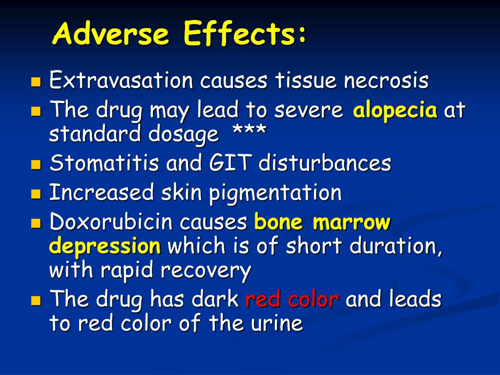 Adverse Effects: • Extravasation causes tissue necrosis • The drug may lead to severealopecia at standard dosage *** • Stomatitis and GIT disturbances • Increased skin pigmentation • Doxorubicin causes bone marrowdepressionwhich is of short duration, with rapid recovery • The drug has dark red color and leads to red color of the urine
