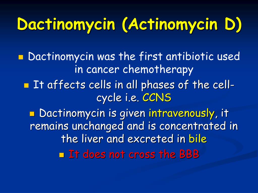 Dactinomycin (Actinomycin D) Dactinomycin was the first antibiotic used in cancer chemotherapy It affects cells in all phases of the cell-cycle i.e. CCNS Dactinomycinis given intravenously, it remains unchanged and is concentrated in the liver and excreted in bile It does not cross the BBB