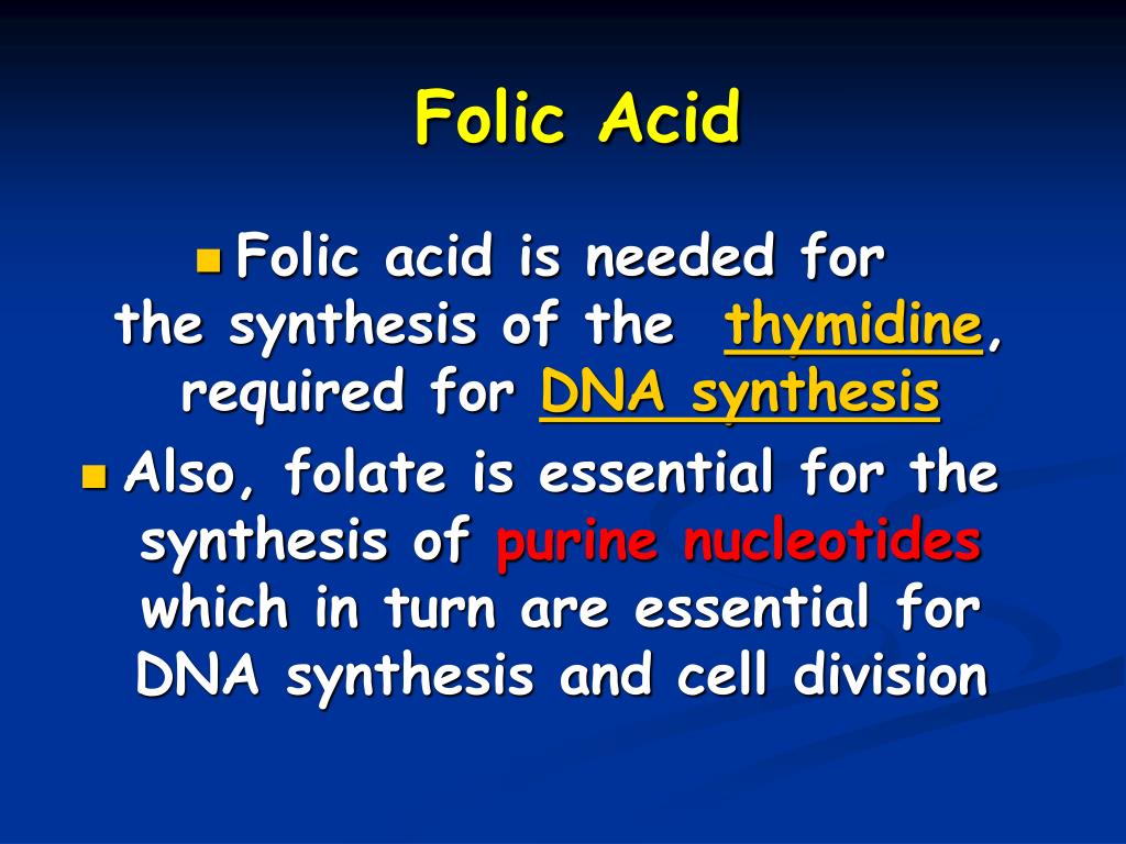 Folic Acid • Folic acid is needed for the synthesis of the thymidine, required for DNA synthesis • Also, folate is essential for the synthesis of purine nucleotides which in turn are essential for DNA synthesis and cell division