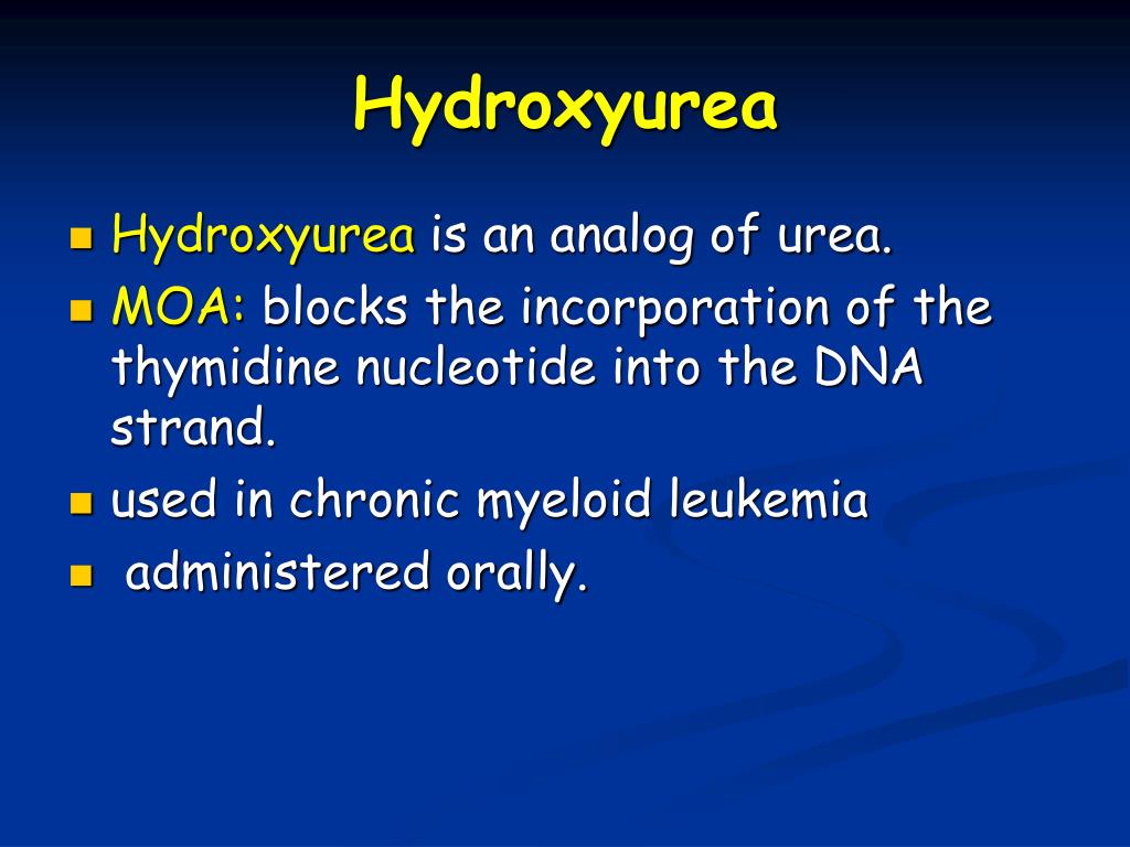 Hydroxyurea Hydroxyureais an analog of urea. MOA: blocks the incorporation of the thymidine nucleotide into the DNA strand. used in chronic myeloid leukemia administered orally.