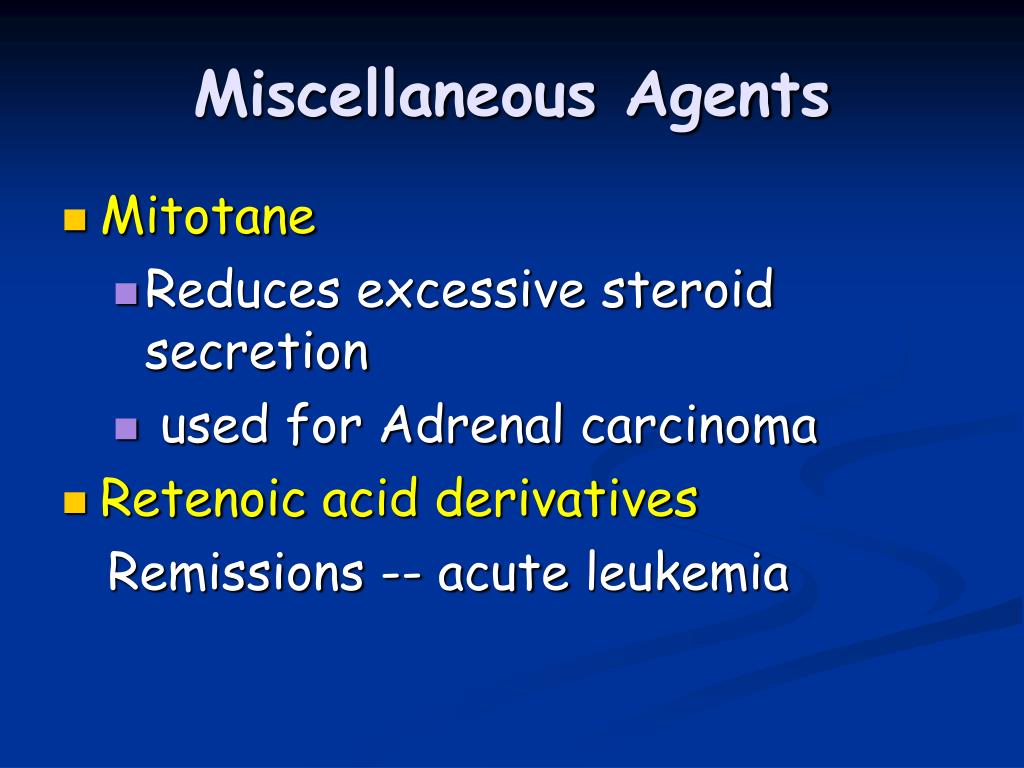 Miscellaneous Agents • Mitotane • Reduces excessive steroid secretion • used for Adrenal carcinoma • Retenoic acid derivatives Remissions -- acute leukemia