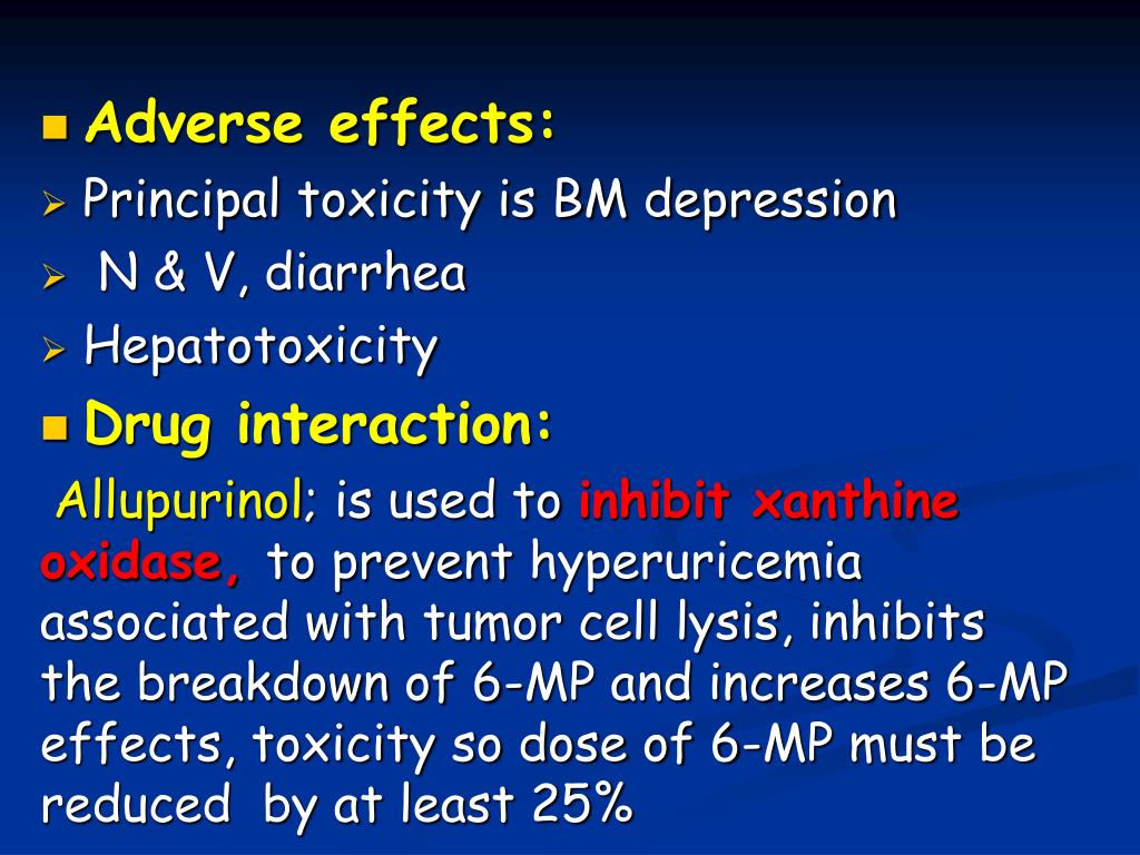 Adverse effects: • Principal toxicity is BM depression • N & V, diarrhea • Hepatotoxicity • Drug interaction: Allupurinol; is used to inhibit xanthine oxidase, to prevent hyperuricemia associated with tumor cell lysis, inhibits the breakdown of 6-MP and increases 6-MP effects, toxicity so dose of 6-MP must be reduced by at least 25%