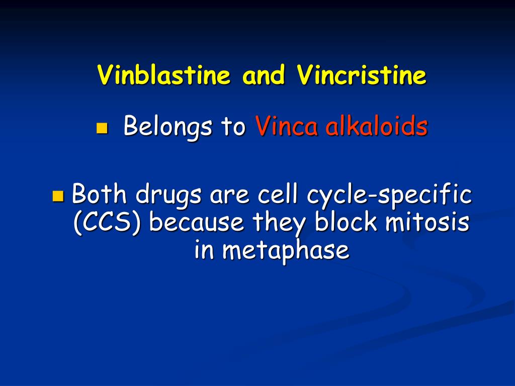 Vinblastine and Vincristine • Belongs to Vincaalkaloids • Both drugs are cell cycle-specific (CCS) because they block mitosis in metaphase