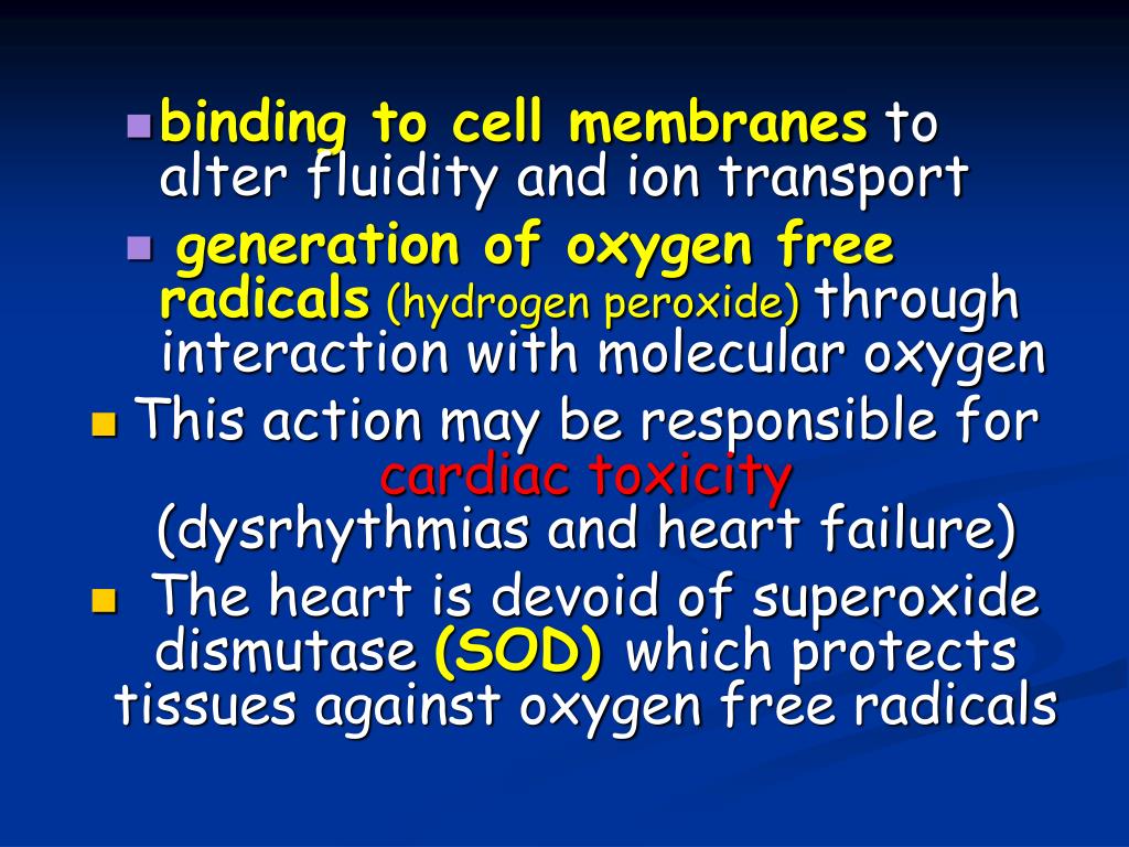 binding to cell membranesto alter fluidity and ion transport • generation of oxygen free radicals(hydrogen peroxide) through interaction with molecular oxygen • This action may be responsible for cardiac toxicity (dysrhythmias and heart failure) • The heart is devoid of superoxide dismutase (SOD) which protects tissues against oxygen free radicals