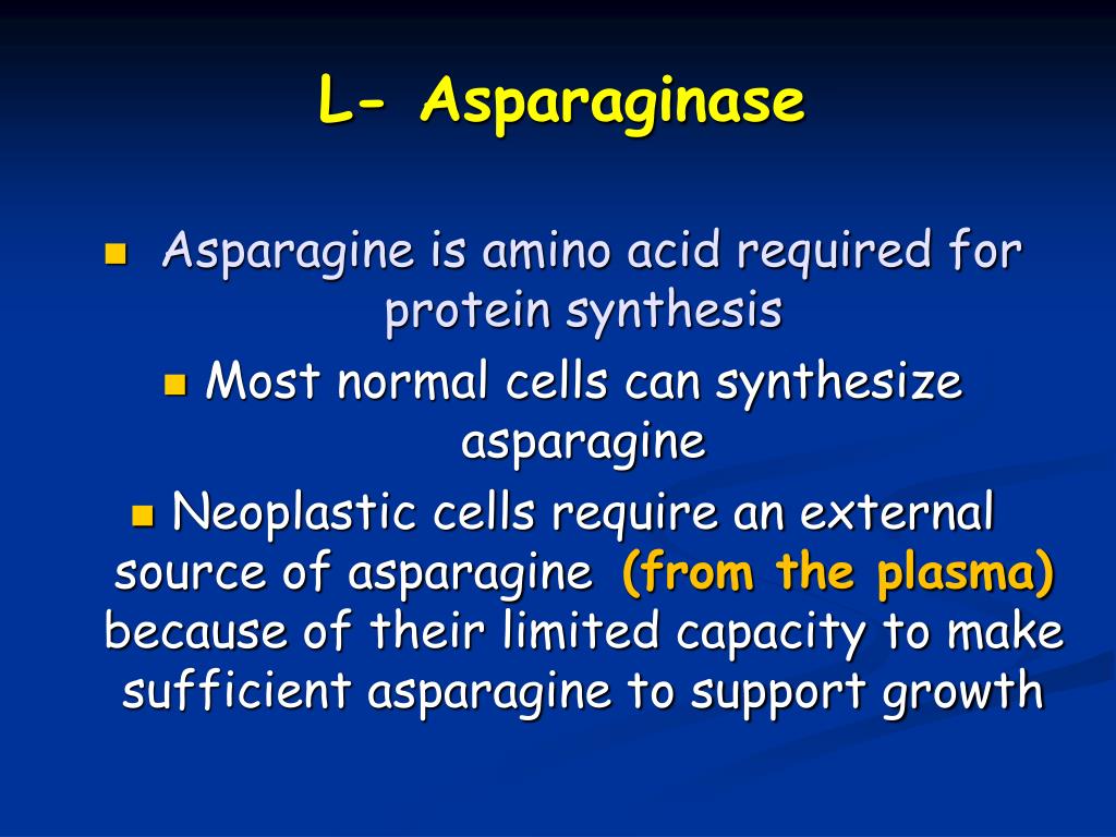 L- Asparaginase • Asparagine is amino acid required for protein synthesis • Most normal cells can synthesize asparagine • Neoplastic cells require an external source of asparagine (from the plasma) because of their limited capacity to make sufficient asparagine to support growth