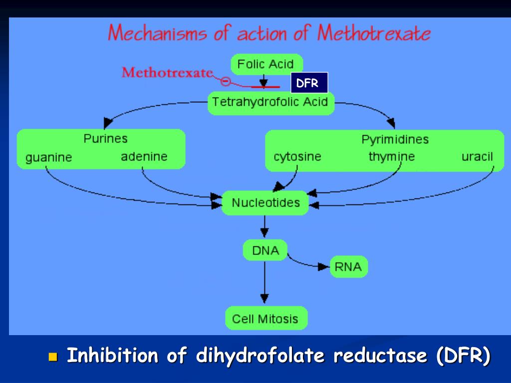 A. Folic Acid AntagonistsMethotrexate (MTX) • MTX is structurally related to folic acid and acts as an antagonist of that vitamin by inhibiting dihydrofolatereductase • This enzyme converts folic acid to its active, coenzyme form (FH4);tetrahydrofolic acid • Methotrexate has a higher affinity than Folatefor dihydrofolatereductase and thus inhibits the enzyme = depleting intracellular FH4
