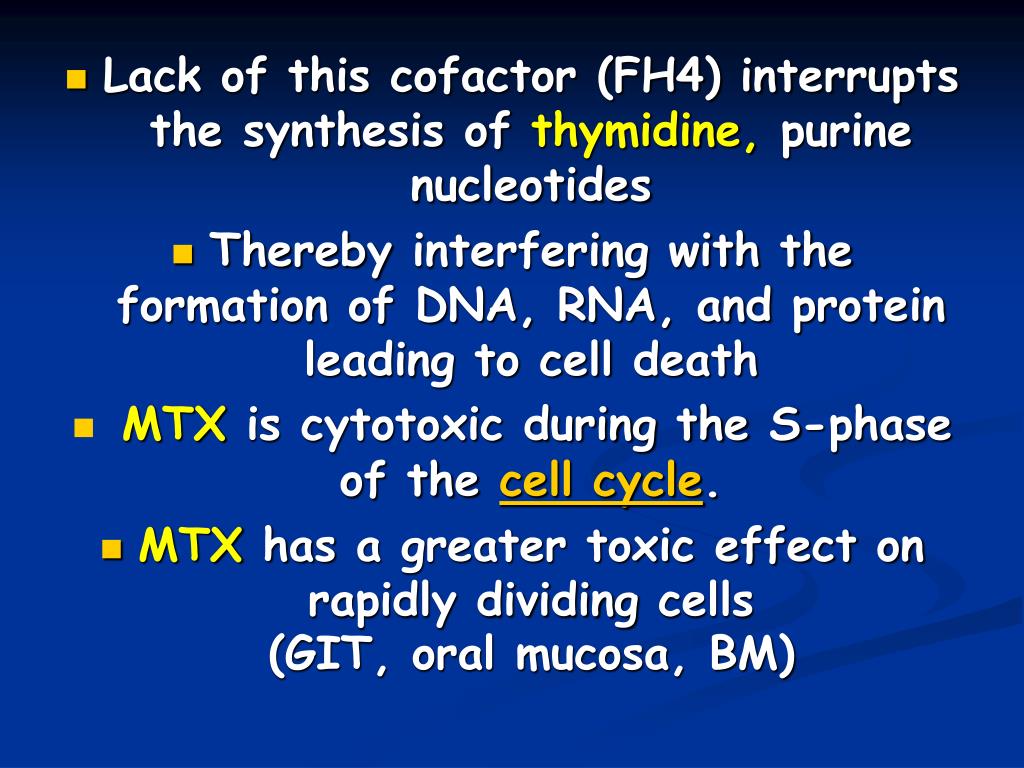 Lack of this cofactor (FH4) interrupts the synthesis of thymidine,purine nucleotides • Thereby interfering with the formation of DNA, RNA, and protein leading to cell death • MTX is cytotoxic during the S-phase of the cell cycle. • MTX has a greater toxic effect on rapidly dividing cells (GIT, oral mucosa, BM)
