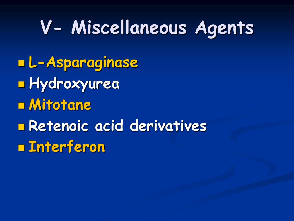 V- Miscellaneous Agents • L-Asparaginase • Hydroxyurea • Mitotane • Retenoic acid derivatives • Interferon