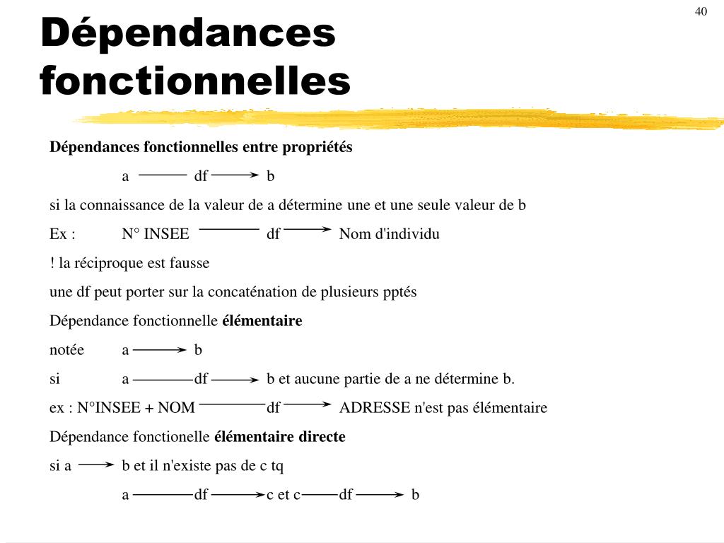 40 Dépendances fonctionnelles Dépendances fonctionnelles entre propriétés a df b si la connaissance de la valeur de a détermine une et une seule valeur de b Ex : N° INSEE df Nom d'individu ! la réciproque est fausse une df peut porter sur la concaténation de plusieurs pptés Dépendance fonctionnelle élémentaire notée a b si a df b et aucune partie de a ne détermine b. ex : N°INSEE + NOM df ADRESSE n'est pas élémentaire Dépendance fonctionelle élémentairedirecte si a b et il n'existe pas de c tq a df c et c df b