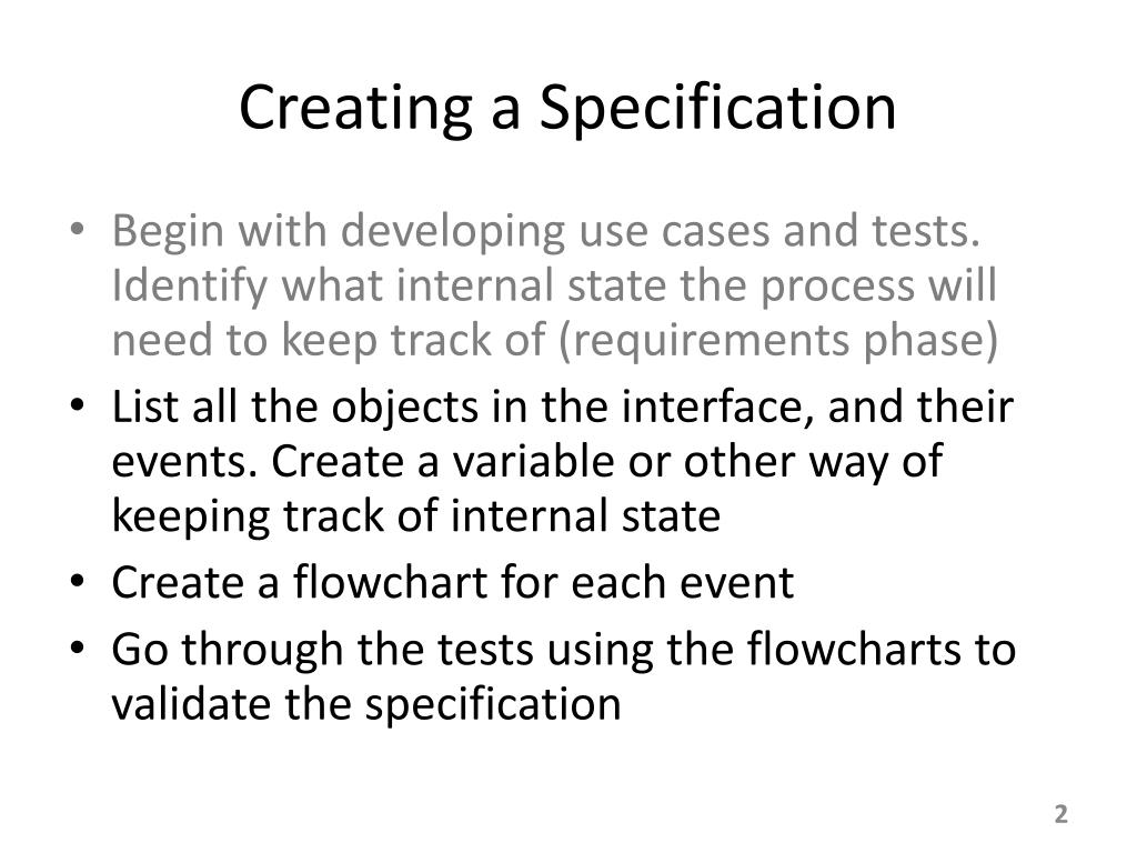 Creating a Specification • Begin with developing use cases and tests. Identify what internal state the process will need to keep track of (requirements phase) • List all the objects in the interface, and their events. Create a variable or other way of keeping track of internal state • Create a flowchart for each event • Go through the tests using the flowcharts to validate the specification