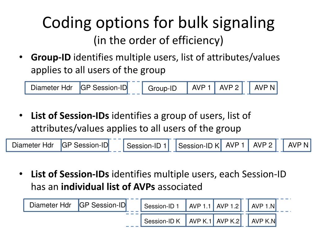Coding options for bulk signaling(in the order of efficiency) • Group-ID identifies multiple users, list of attributes/values applies to all users of the group • List of Session-IDs identifies a group of users, list of attributes/values applies to all users of the group • List of Session-IDs identifies multiple users, each Session-ID has an individual list of AVPs associated Diameter Hdr GP Session-ID AVP 1 AVP 2 AVP N Group-ID Diameter Hdr GP Session-ID AVP 1 AVP 2 AVP N Session-ID 1 Session-ID K Diameter Hdr GP Session-ID Session-ID 1 AVP 1.1 AVP 1.2 AVP 1.N Session-ID K AVP K.1 AVP K.2 AVP K.N