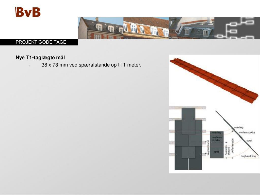 Nye T1-taglægte mål • - 38 x 73 mm ved spærafstande op til 1 meter. • Bestemmelse af lægteafstand for teglsten • - Vejledende lægteafstande • Bestemmelse af lægteafstand for vingetagsten • - 24 stens metoden for vingetagsten • - Prøveoplægning • - Tæthed