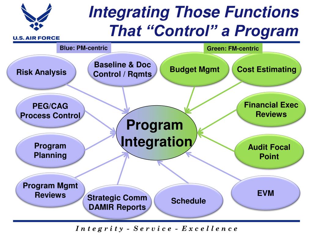 Integrating Those Functions That “Control” a Program Blue: PM-centric Green: FM-centric Baseline & Doc Control / Rqmts Budget Mgmt Cost Estimating Risk Analysis Financial Exec Reviews PEG/CAG Process Control Program Integration Program Planning Audit Focal Point Program Mgmt Reviews EVM Schedule Strategic Comm DAMIR Reports