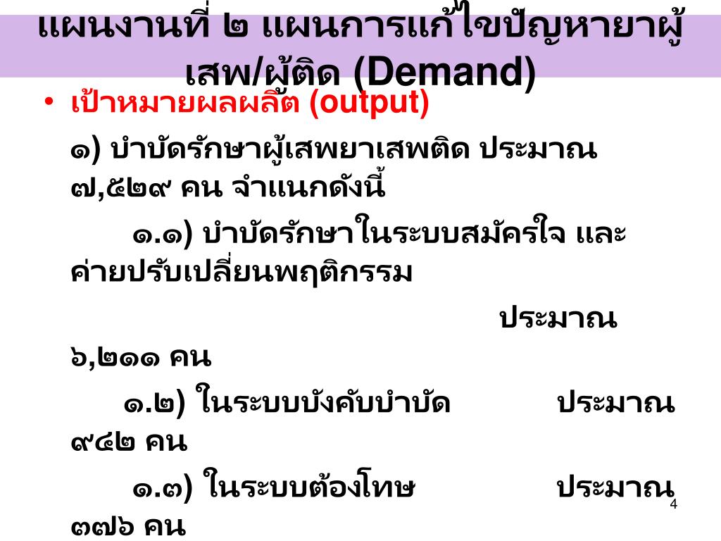 แผนงานที่ ๒ แผนการแก้ไขปัญหายาผู้เสพ/ผู้ติด (Demand) • เป้าหมายผลผลิต (output) ๑) บำบัดรักษาผู้เสพยาเสพติด ประมาณ ๗,๕๒๙ คน จำแนกดังนี้ ๑.๑) บำบัดรักษาในระบบสมัครใจ และค่ายปรับเปลี่ยนพฤติกรรม ประมาณ ๖,๒๑๑ คน ๑.๒) ในระบบบังคับบำบัด ประมาณ ๙๔๒ คน ๑.๓) ในระบบต้องโทษ ประมาณ ๓๗๖ คน ๒) ติดตามผู้เสพที่ผ่านการบำบัดรักษา ไม่ให้กลับมาเสพซ้ำอีก ร้อยละ ๘๐ ใน ๑ ปี จำนวน ๖๐๒๓