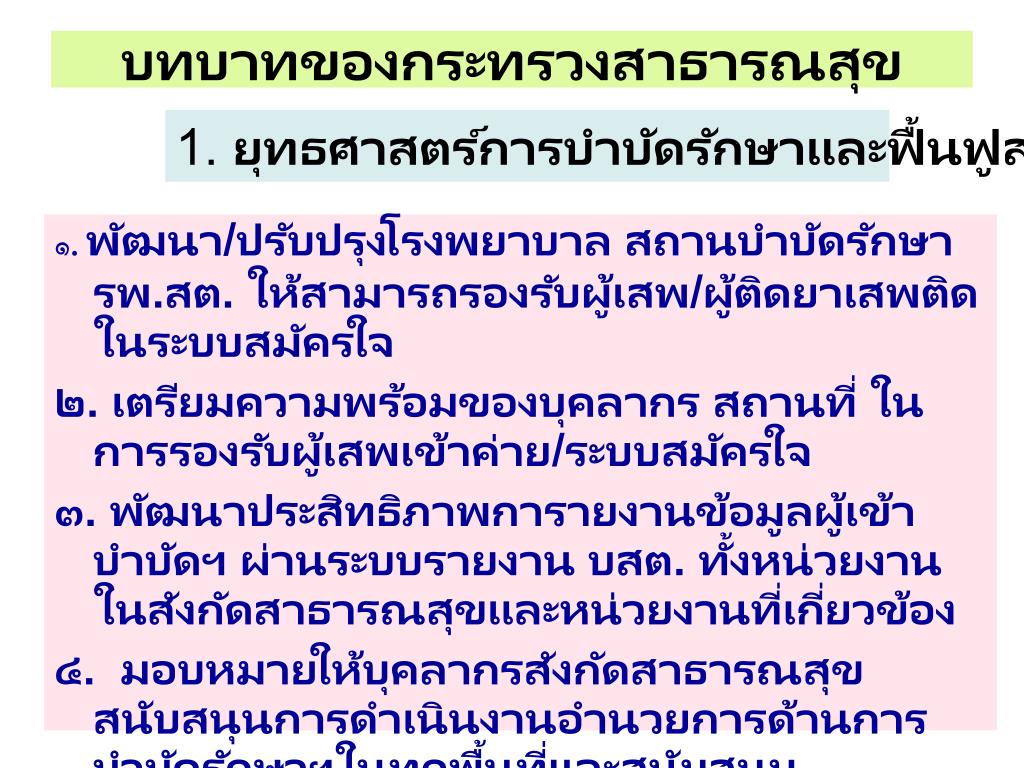 บทบาทของกระทรวงสาธารณสุขบทบาทของกระทรวงสาธารณสุข 1. ยุทธศาสตร์การบำบัดรักษาและฟื้นฟูสมรรถภาพ ๑. พัฒนา/ปรับปรุงโรงพยาบาล สถานบำบัดรักษา รพ.สต. ให้สามารถรองรับผู้เสพ/ผู้ติดยาเสพติด ในระบบสมัครใจ ๒. เตรียมความพร้อมของบุคลากร สถานที่ ในการรองรับผู้เสพเข้าค่าย/ระบบสมัครใจ ๓. พัฒนาประสิทธิภาพการายงานข้อมูลผู้เข้าบำบัดฯ ผ่านระบบรายงาน บสต. ทั้งหน่วยงานในสังกัดสาธารณสุขและหน่วยงานที่เกี่ยวข้อง ๔. มอบหมายให้บุคลากรสังกัดสาธารณสุขสนับสนุนการดำเนินงานอำนวยการด้านการบำบัดรักษาฯในทุกพื้นที่และสนับสนุนงบประมาณในการนำผู้เสพเข้าค่ายปรับเปลี่ยนพฤติกรรม