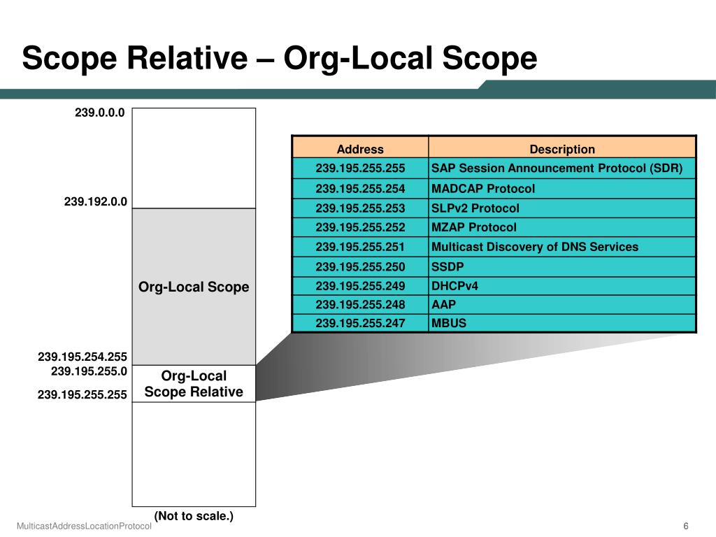 Scope Relative – Org-Local Scope 239.0.0.0 239.192.0.0 Org-Local Scope 239.195.254.255 239.195.255.0 Org-Local Scope Relative 239.195.255.255 (Not to scale.)