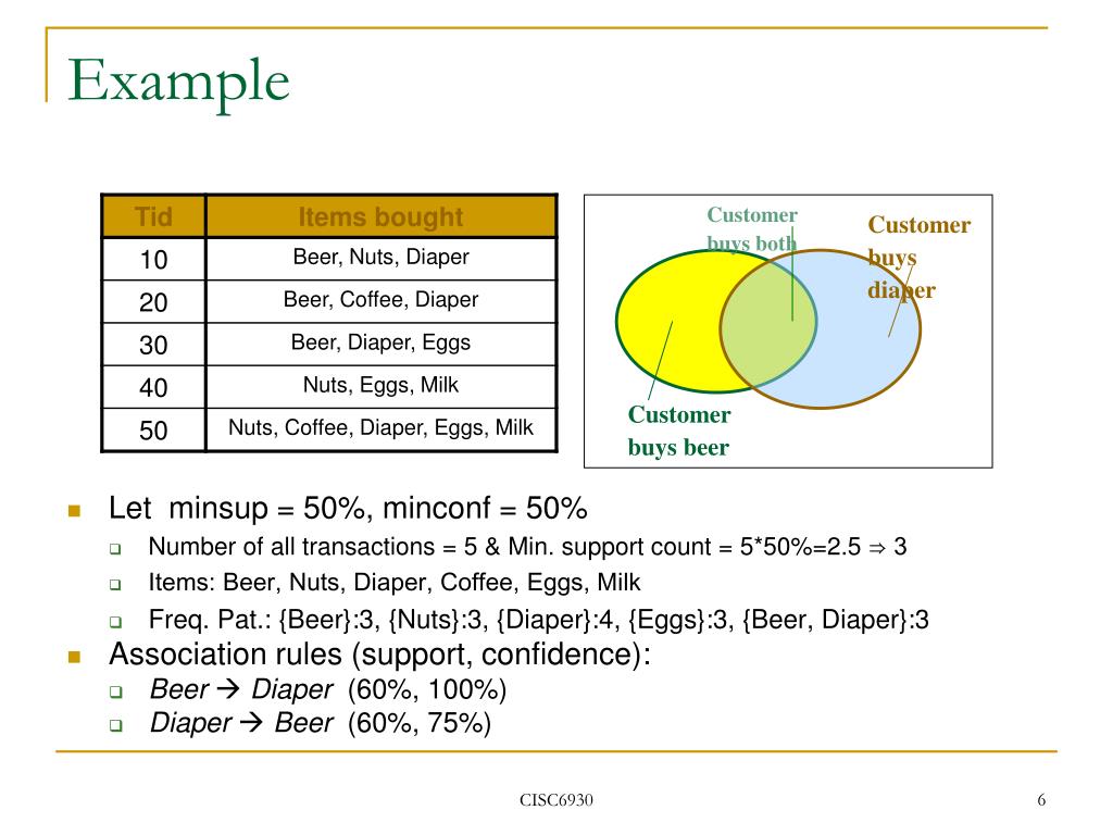 Customer buys both Customer buys diaper Customer buys beer Example • Let minsup = 50%, minconf = 50% • Number of all transactions = 5 & Min. support count = 5*50%=2.5 ⇒ 3 • Items: Beer, Nuts, Diaper, Coffee, Eggs, Milk • Freq. Pat.: {Beer}:3, {Nuts}:3, {Diaper}:4, {Eggs}:3, {Beer, Diaper}:3 • Association rules (support, confidence): • Beer Diaper (60%, 100%) • Diaper Beer (60%, 75%) CISC6930