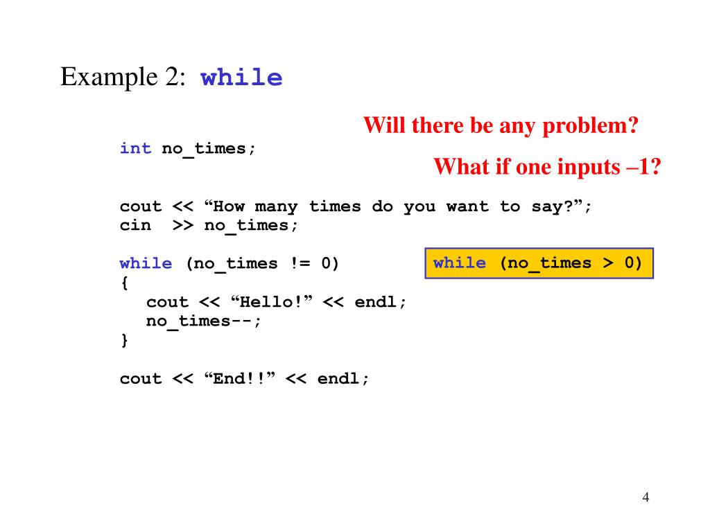 Example 2: while Will there be any problem? int no_times; cout << “How many times do you want to say?”; cin >> no_times; while (no_times != 0) { cout << “Hello!” << endl; no_times--; } cout << “End!!” << endl; What if one inputs –1? while (no_times > 0)