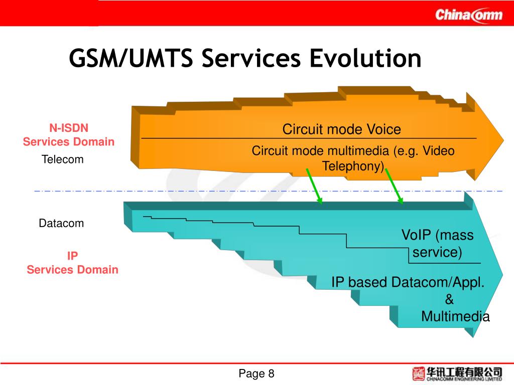 GSM/UMTS Services Evolution Circuit mode Voice N-ISDN Services Domain Circuit mode multimedia (e.g. Video Telephony) Telecom Datacom VoIP (mass service) IP Services Domain IP based Datacom/Appl. & Multimedia