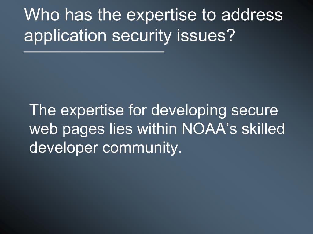 Who has the expertise to address application security issues? The expertise for developing secure web pages lies within NOAA’s skilled developer community.
